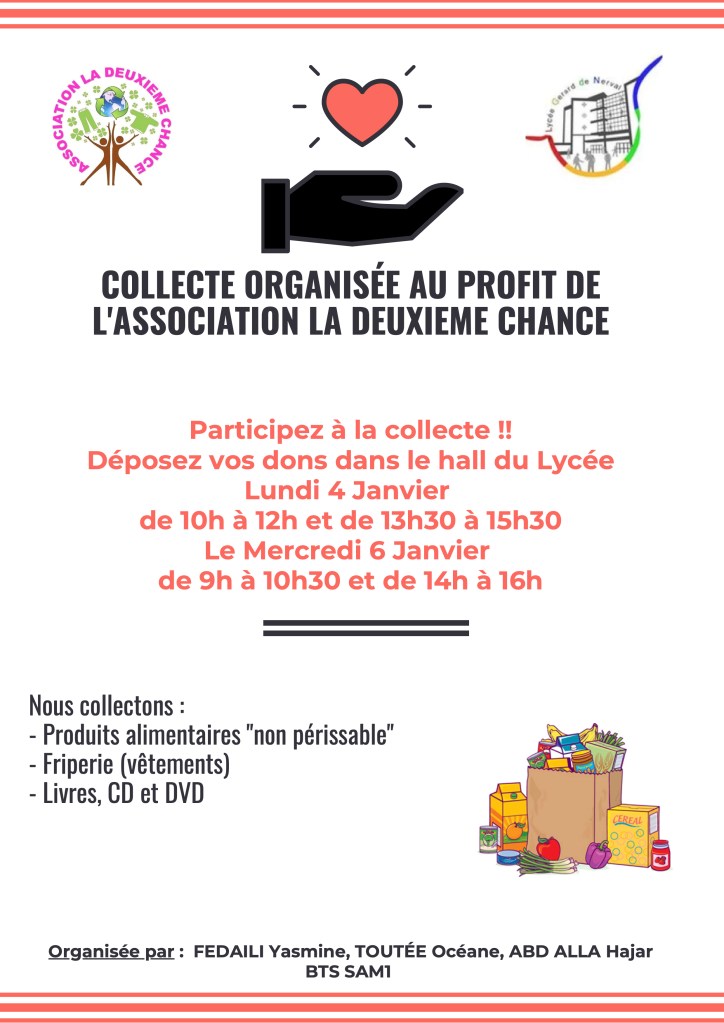 COLLECTE ORGANISÉE AU PROFIT DE L’ASSOCIATION LA DEUXIEME CHANCE Partager : Imprimer(ouvre dans une nouvelle fenêtre) Imprimer Envoyer un lien par e-mail à un ami(ouvre dans une nouvelle fenêtre) E-mail Partager sur X(ouvre dans une nouvelle fenêtre) X Partager sur Facebook(ouvre dans une nouvelle fenêtre) Facebook