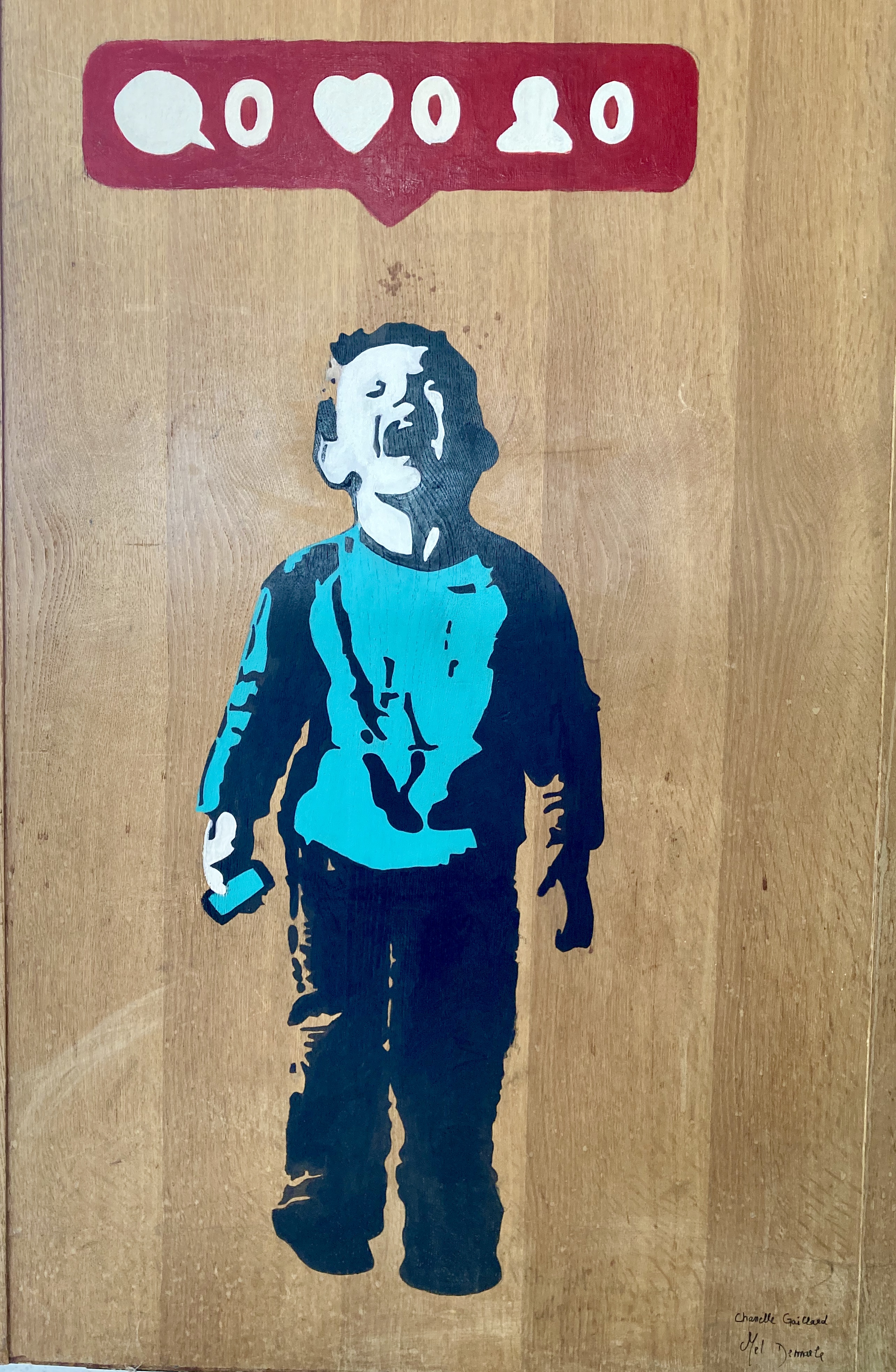 Par le biais de ce projet, les élèves souhaitent sensibiliser leurs camarades sur l’emprise des réseaux sociaux sur nos vies. On observe au-dessus de la tête du jeune garçon une bulle de conversation contenant le logo des messages, celui des likes ainsi que celui des contacts. Et on remarque qu’il n’a ni conversation, ni like et aucun contact, ce qui le rend malheureux.