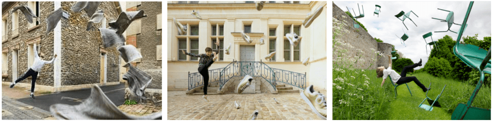 Lors d’une sortie en septembre au festival « C’est comme ça » à Château-Thierry, nous avons pu découvrir les œuvres de Quentin Bertoux, photographe, et découvrir sa technique. Celui-ci lance un objet lié à la démarche d’un artiste. Il prend plusieurs photos jusqu’à sa chute au sol. A l’aide d’un logiciel, il met ensuite en scène sur une même photo l’artiste au milieu de l’objet démultiplié à différents endroits.