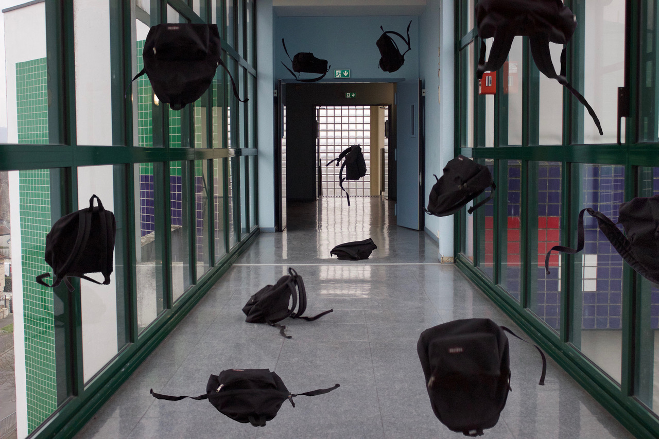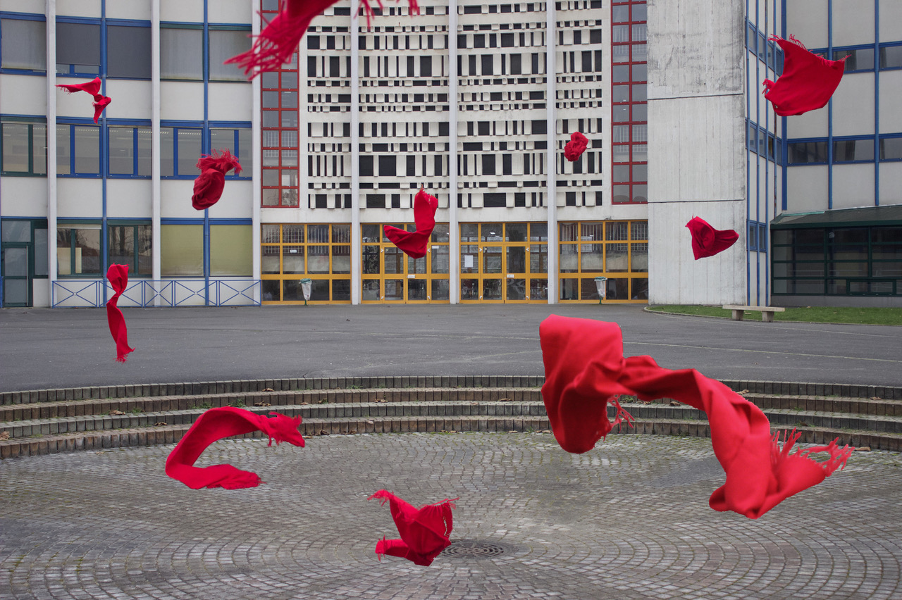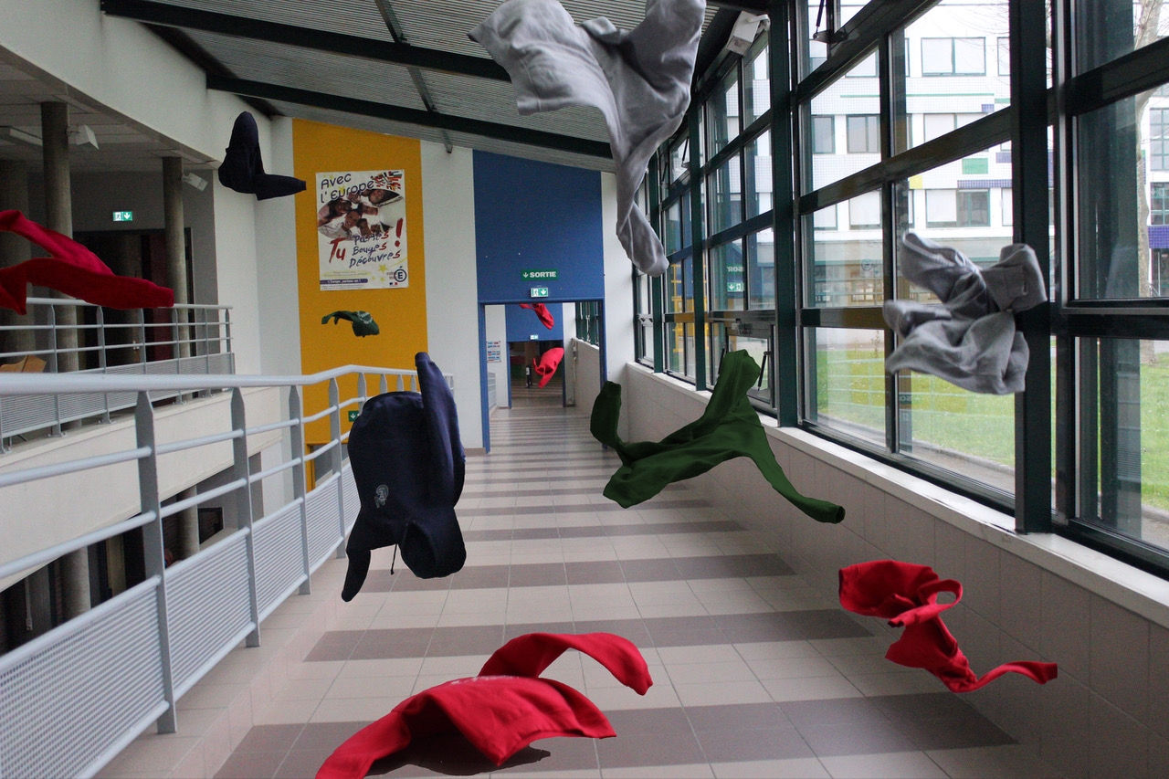 Pour ce projet, nous nous sommes donc inspirées de la technique de Quentin Bertoux et avons détourné plusieurs endroits du lycée (couloirs, salle de classe…) avec des objets basés sur la thématique du tissu, que l’on retrouve au sein de l’établissement. Ainsi, vous pourrez voir une accumulation de vêtements du quotidien : manteau, écharpe, sac,… lancés à travers le lycée. Ici, le personnage, c’est le lycée.