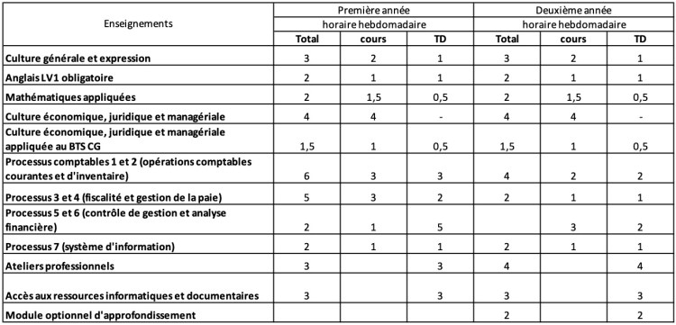 Les enseignements professionnels sont dispensés comme dans les entreprises, par « Processus » et couvrent les domaines de la comptabilité générale, de la fiscalité, du social, de la gestion, de la finance et de l’informatique appliquée.